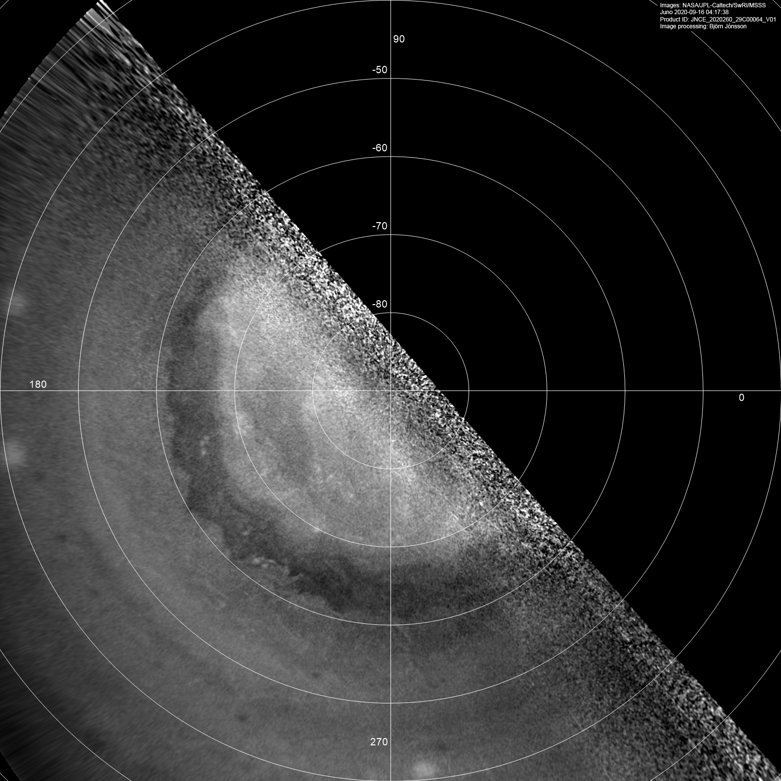 An image obtained using JunoCam's methane filter. This is a heavily processed south polar projection map showing the area around Jupiter's south pole. Latitudes are planetographic and longitudes are System III.