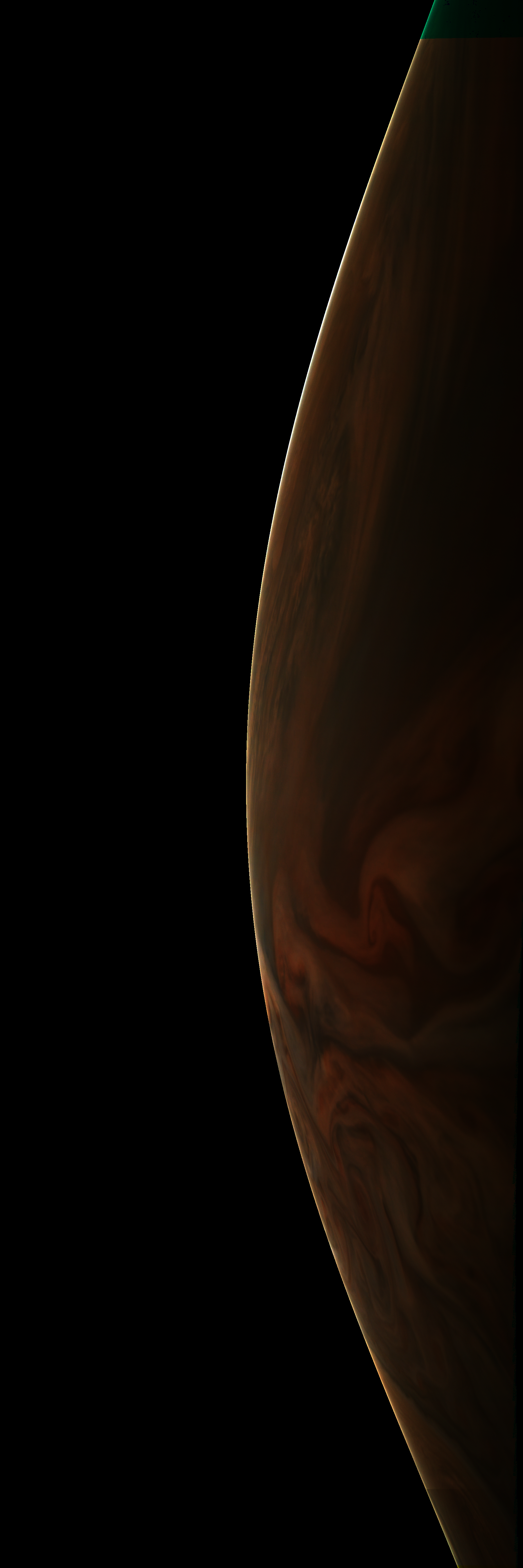 Resolution is 30 pixels per degrees in an equidistant cylindrical system centered to the camera at image stop time, with an axis parallel to Juno's spin axis. The rendered field of view is 60x180 degrees.