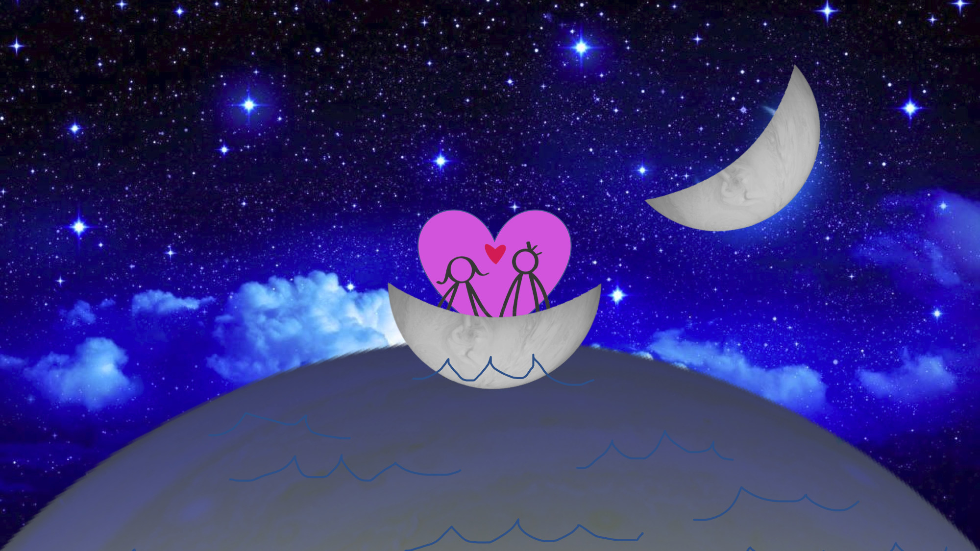 Two lovers on a moon love boat on a body of water (coincidencidentally also a moon!)