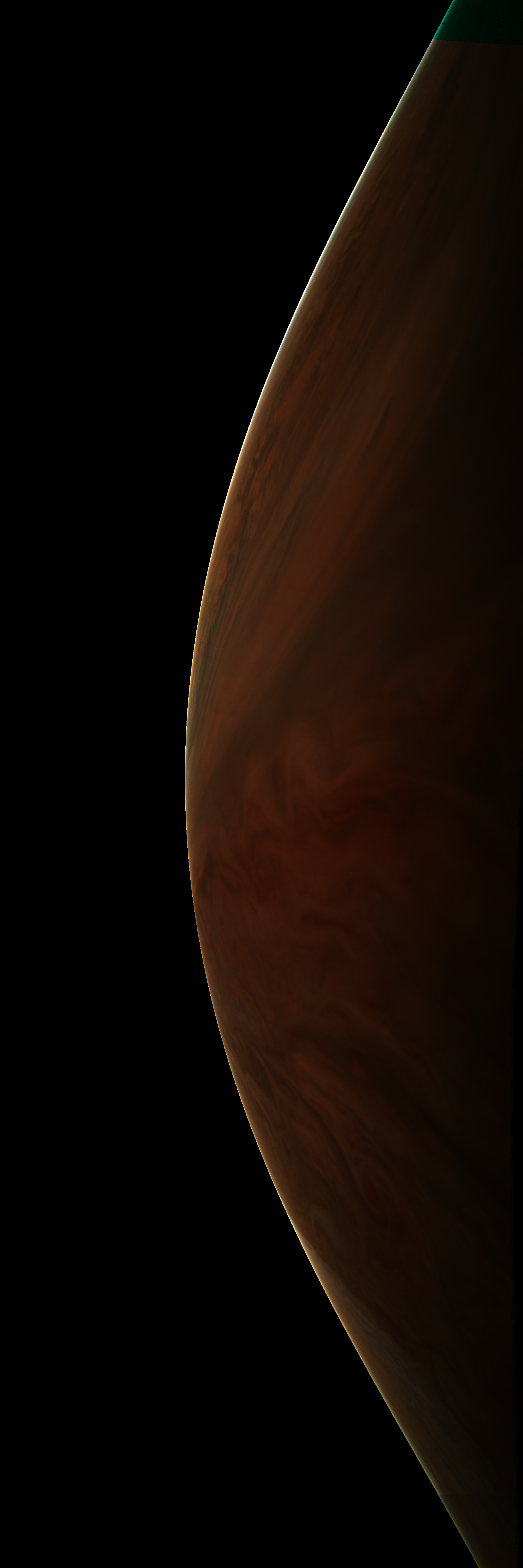 Resolution is 30 pixels per degrees in an equidistant cylindrical system centered to the camera at image stop time, with an axis parallel to Juno's spin axis. The rendered field of view is 60x180 degrees.