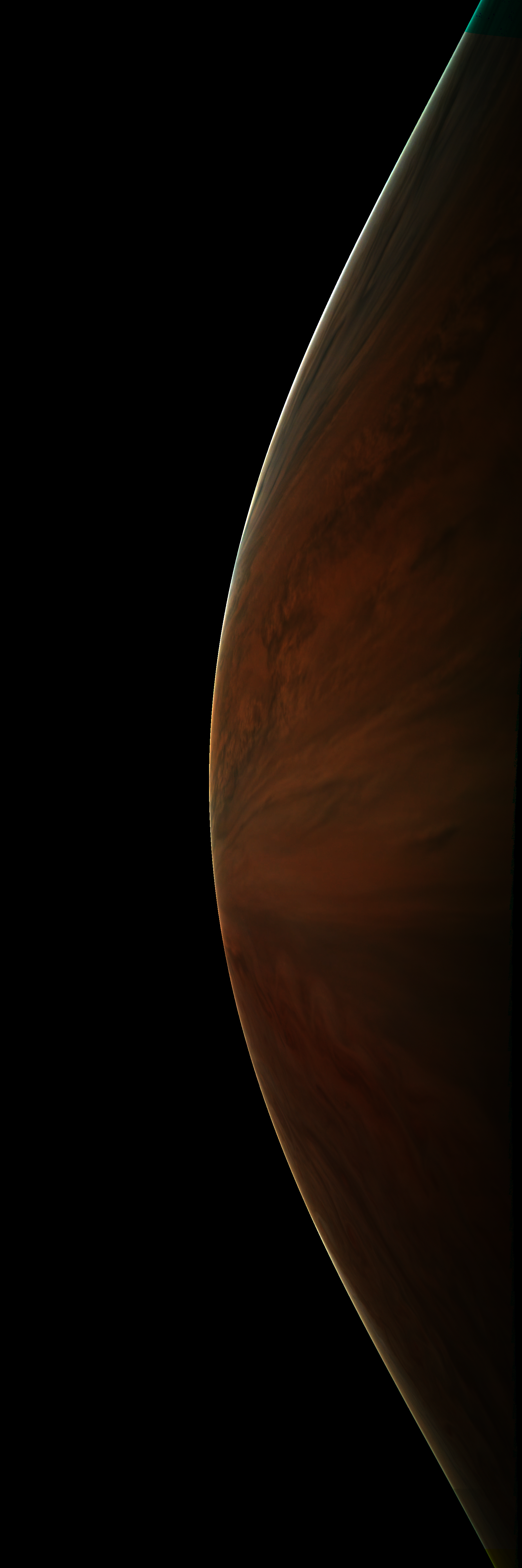 Resolution is 30 pixels per degrees in an equidistant cylindrical system centered to the camera at image stop time, with an axis parallel to Juno's spin axis. The rendered field of view is 60x180 degrees.