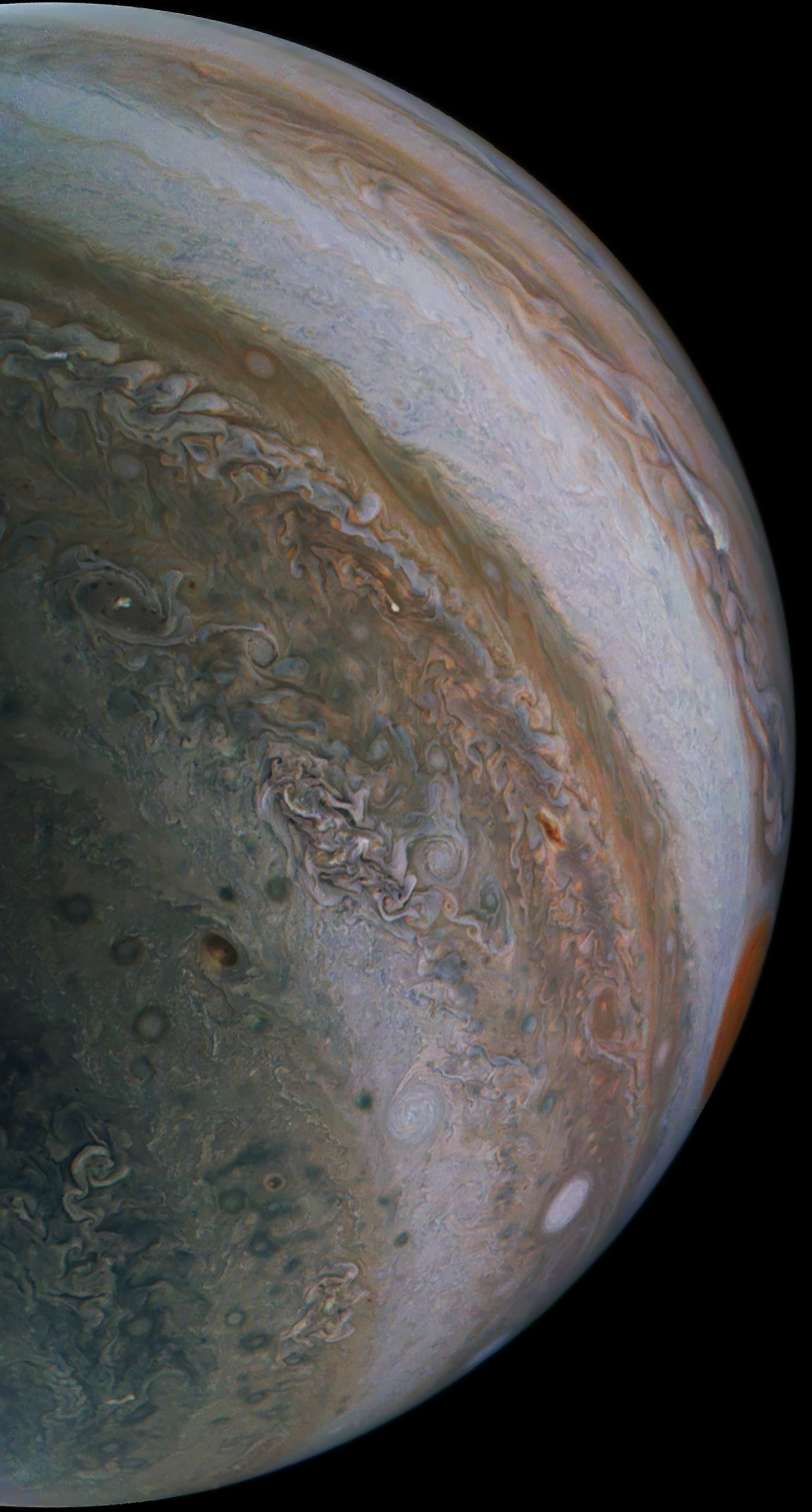 The Great Red Spot is partially seen on the edge of the disk in this capture of the Juno Spacecraft interesting storms can be seen near the South Pole that look a little like vortices. Note the darkest storm visible in this image below centre.