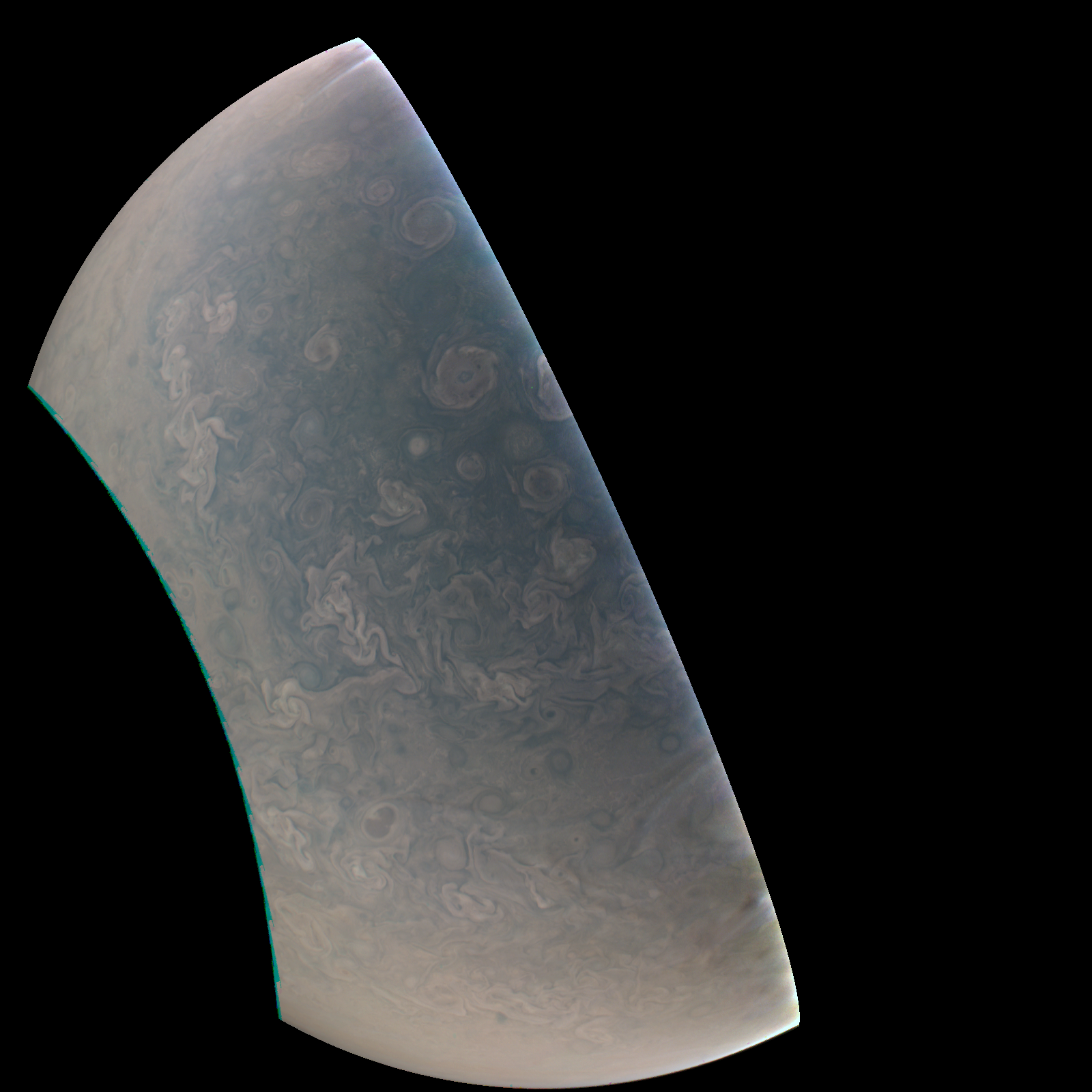 Junocam pixels are 12 bits deep from the camera but are converted to 8 bits inside the instrument using a lossless "companding" table, a process similar to gamma correction, to reduce their size. All Junocam products on the missionjuno website are in this 8-bit form as received on Earth. Scientific users interested in radiometric analysis should use the "RDR" data products archived with the Planetary Data System, which have been converted back to a linear 12-bit scale.
