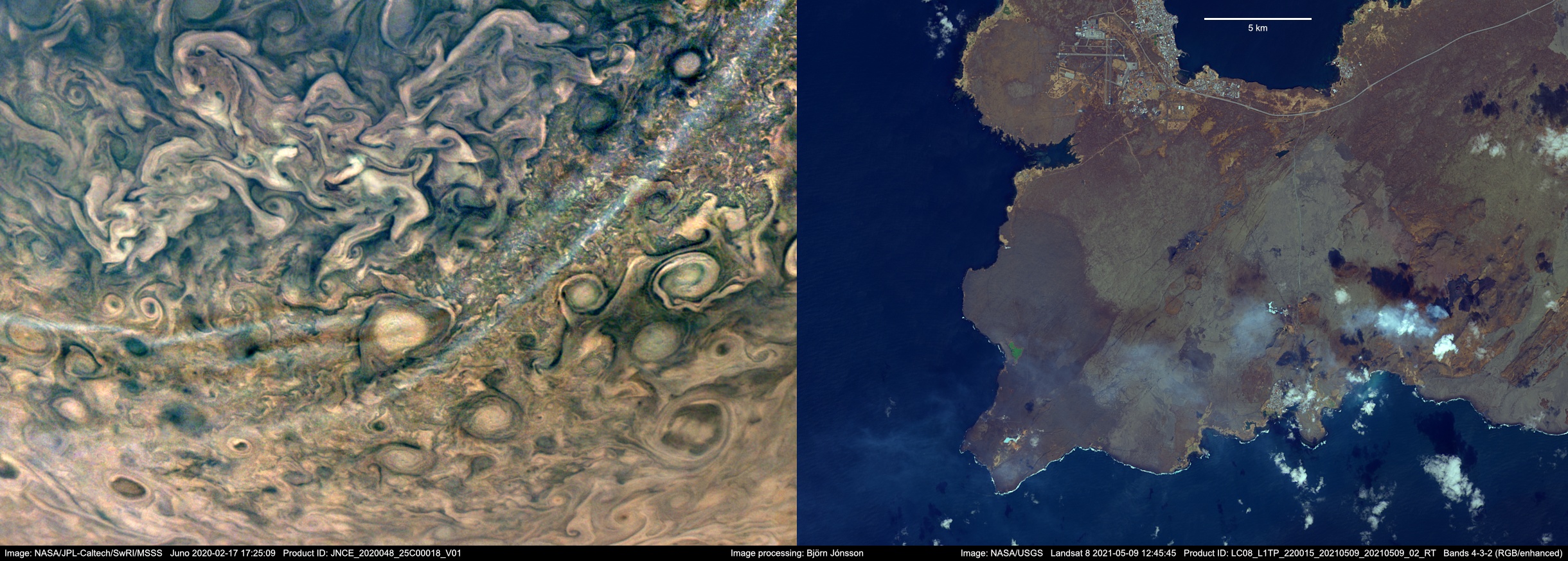 The image at right in the montage was obtained by Landsat 8 on May 9, 2021. It is processed from bands 4, 3 and 2 (red/green/blue) and includes the site of the ongoing Geldingadalir volcanic eruption in Iceland. The volcanic plume containing sulphur dioxide (SO2) among other things is clearly visible; clouds and hazes associated with it extend to the west (or WSW). What this has in common with the image of Jupiter is that the plume and associated haze also appears slightly bluish and casts brownish shadows (this can be verified by looking at earlier images; the shadows are real features, there are no dark and/or brownish areas where the shadows are located). These shadows also appear different from shadows cast by regular clouds in the image. This image is slightly enhanced to better show the plume and the shadows and the color saturation was also increased. The JunoCam image is much more heavily processed.