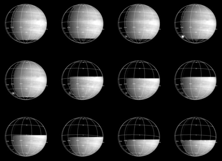 These 12 images of Jupiter and the luminous night-side impact of fragment W of Comet Shoemaker-Levy 9 were taken by the Galileo spacecraft on July 22, 1994. Reading from left to right in each row from the top, they present a 30-second history of the initial phase of the impact event.